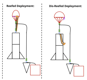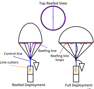 Reefind is a parachute technique that allows the initial diameter of the parachute to be restricted by adding a control line to the bottom of the parachute, which is pulled to a certain circumference and forces the parachute to follow, thus restricting the diameter. In order to disreef and expand to the parachute's full size, the control line is cut. Demonstrator utilized a semicircle method of reefing. Two lines are wrapped in semicircles around half of the parachute. They both run through the middle, where a third line, the control line, pulls them down and towards the center. The control line is responsible for tensioning the two semicricle loops and keeping the radius constrained. This control line is then threaded down into the line cutters. When the electronics system senses the altitude of 1500 ft, it ignites the black powder within the line cutters, which cut the control line and release the full parachute.