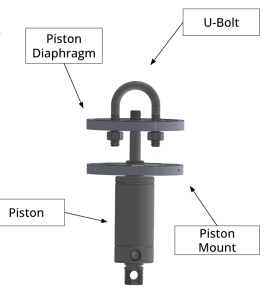 The piston system is composed of a piston, a piston mount, a piston diaphragm, a u-bolt, and a control line reefing part (not shown, is screwed onto the piston above the diaphragm and situated under the u-bolt). The piston is actuated by a firebolt containing black powder. Two are included in the parachute for failure mode mitigation. The piston then pushes forward. The piston mount is attached to the MPT to hold the piston in place. The piston diaphragm attaches the u-bolt and is situated to press against the lip of the nose cone. When the piston actuates, the piston diaphragm moves upwards, breaking the shear pins holding the nose cone to the MPT and disconnecting the nose cone from the rocket. The nose cone and parachute are attached to the MPT through lines attached to a quicklink attached to the u-bolt. When the piston actuates, these lines go under tension, which yanks parachute out of the parachute bag and nose cone, deploying the parachute. The parachute bag is attached to the nose cone so that it falls with the rocket.