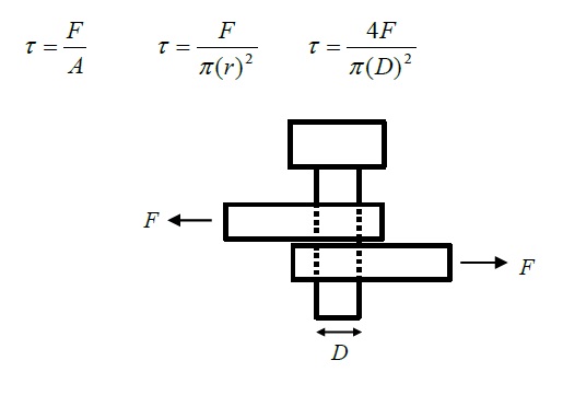 Our bolt is under a single shear, which looks like the reference diagram below. In order to evaluate the shear stress, we need to use the equation on the right. Our bolts have a diameter of 1/4 of an inch.