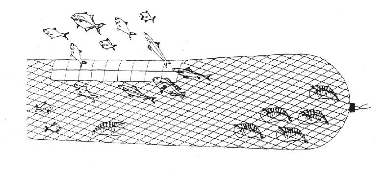 Radial Escape Sections for prawn nets are made so that fish can swim out of a large circular ring-shaped panel of square mesh. A net funnel focuses the animals into the mid section of the cod end where the fish can swim forward and out the open square mesh while prawn remain in the cod end due to their inability to swim forward (FAO Equipment Profile RES)