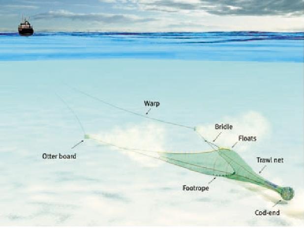 Demersal Otter Trawls are also dragged along the sea floor to where boards on the net guide fish into the cone shaped net where they swim. Once exhausted, the fish move backward in the net through the funnel into the cod-end, the fish keeping receptacle of the net (Fishing Methods ¶ 2).