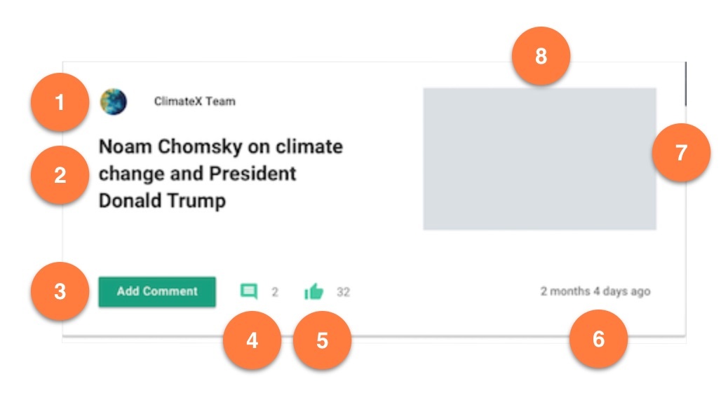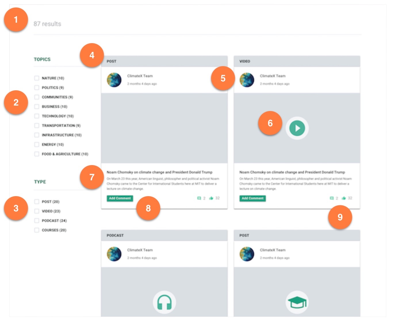 - Title of card – clicks to Card Detail page (post, project, podcast, video)