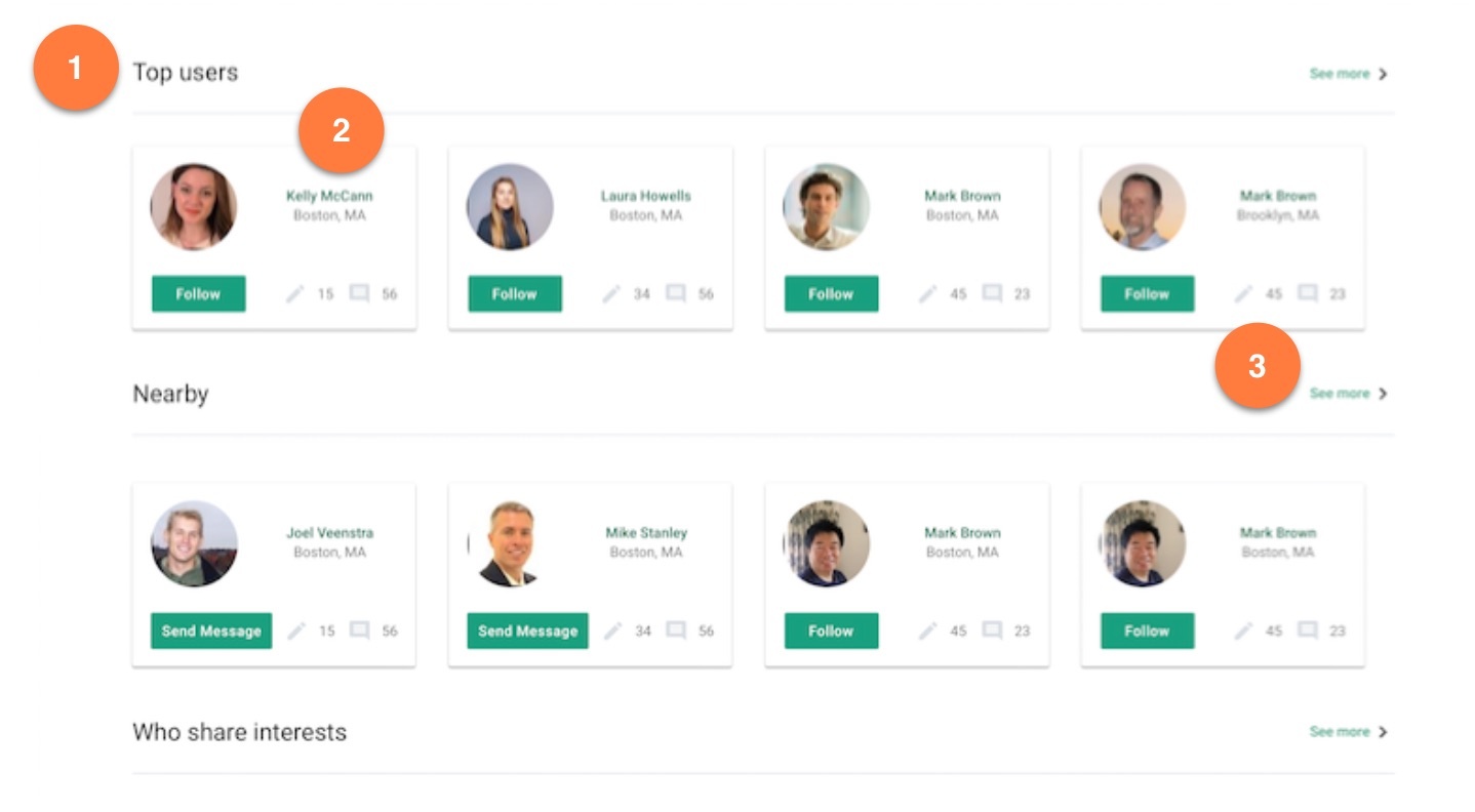 Connect (Members) Home |  | Sprint 2 This is the landing page after a click on "Connect" from Top Nav - The page is broken into sort categories with 4 card per categoryPerson Card (see below)See More link goes to Connect Category Detail page (see below)