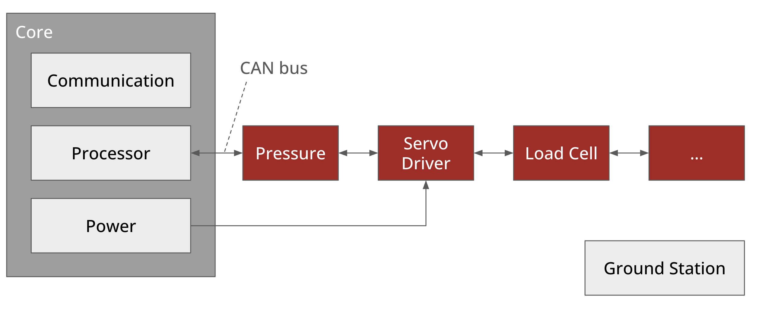 Within the core assembly of Papyrus, there are three modules: the communication module, the processor module, and the power module. The communication module handles handles data exchange between the ground station and test stand, the processor contains a microcontroller that takes in data from engine instrumentation, and the power module provides power to the whole board.