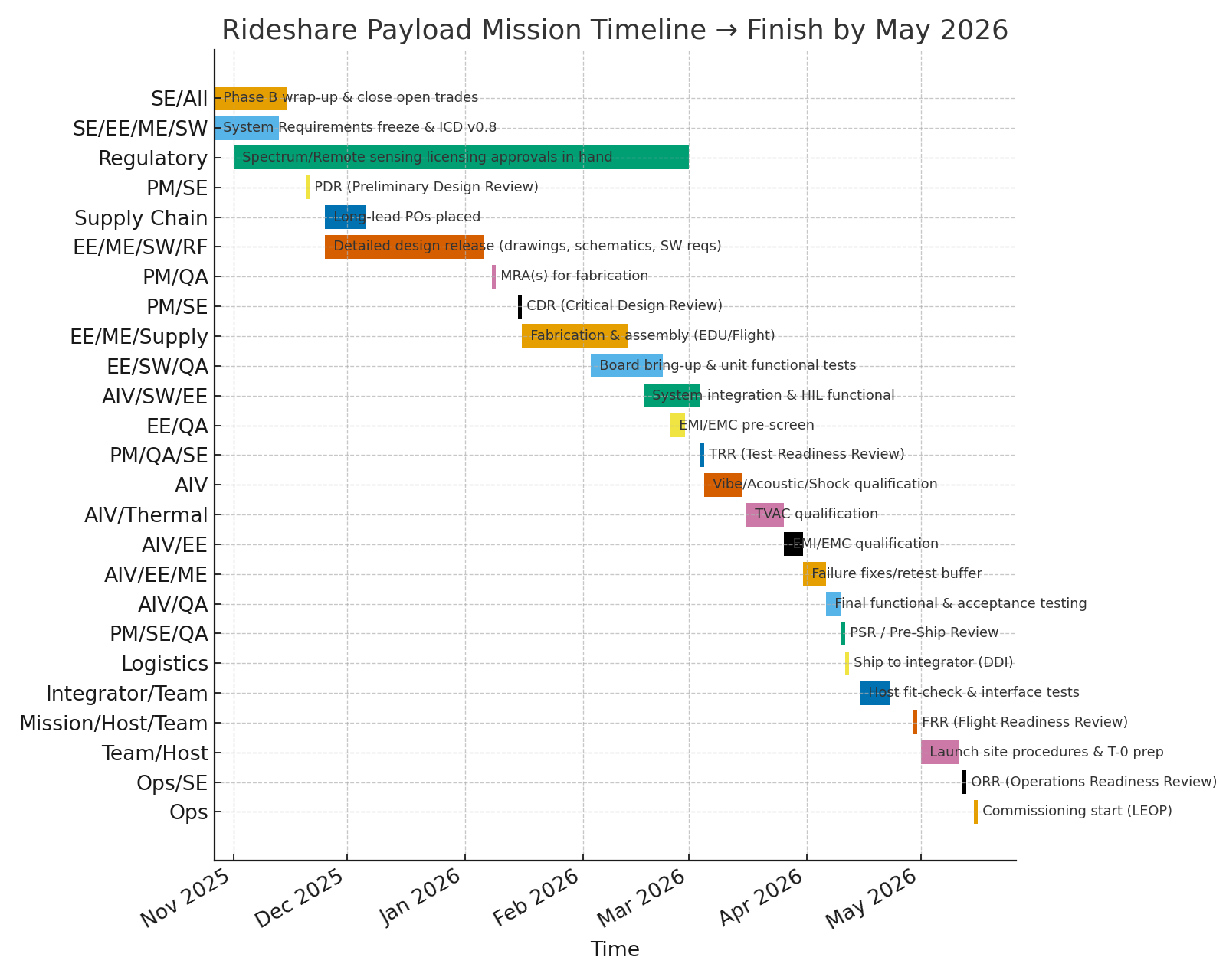 WBS & Org: SE, Payload HW, Payload SW/FPGA, AIV, SMA, Ops, Ground, Regulatory, Supply Chain.