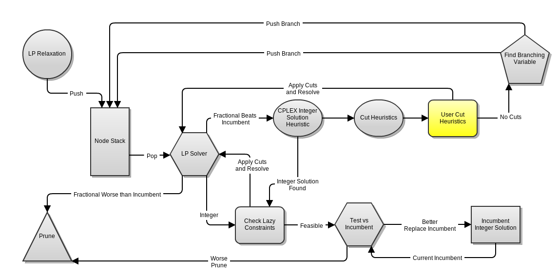 The final method requires some explanation. The "cut loop" refers to the loop in the above diagram where CPLEX looks for cuts, adds cuts, and resolves the LP relaxation. While CPLEX could do this indefinitely until an optimal integer solution was found (which would solve the whole IP, see cutting plane method and chapter 9 of Optimization over the Integers), this would generally take a long time. Instead, CPLEX uses some internal Heuristics (which you can toggle, although I don't recommend it) to control how many cuts to add, then it "exits the cut loop" and will not generate more cuts. By calling isAfterCutLoop, you can tell if CPLEX is done adding cuts before you start adding your own. It might be a good idea to wait until CPLEX is done, as the cuts it adds may change the LP so much that the cut you were about to add becomes irrelevant. Alternatively, the cut you add may cause CPLEX to add smarter cuts. Whether or not waiting until the cut loop is over to add cuts is something that you will need to determine for your own problem.
