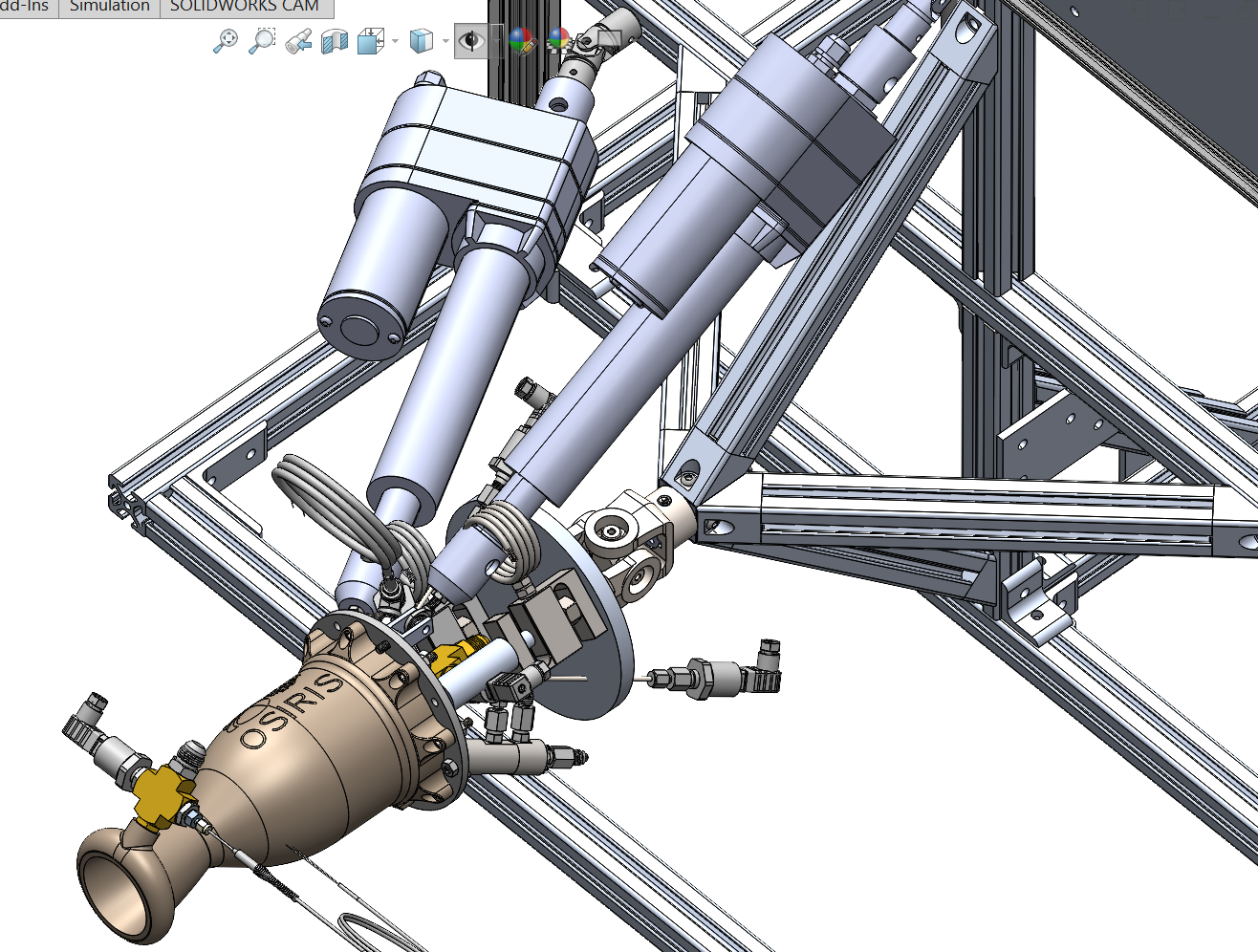 In the Fall of 2018, the team began the Helios engine project. Helios is a pressure-fed bi-propellant liquid engine designed to produce 350lbf, and is fed with diluted Ethanol & LOX by an accompanying test stand. Helios's main goals are to understand basic engine design principles and learn how to efficiently and safely test high-pressure engines. As of now, Helios has been successfully assembled, and was successfully hot fired on May 16th, 2024.